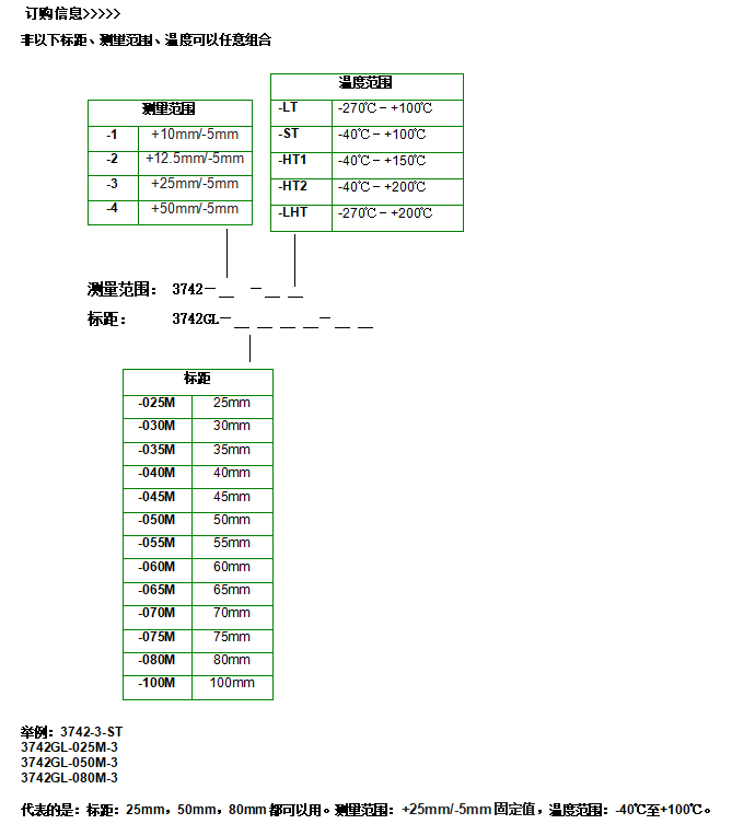 对于订购信息中未列出的标距长度,请参见型号 3442、3542、3542L 和 Epsilon ONE。